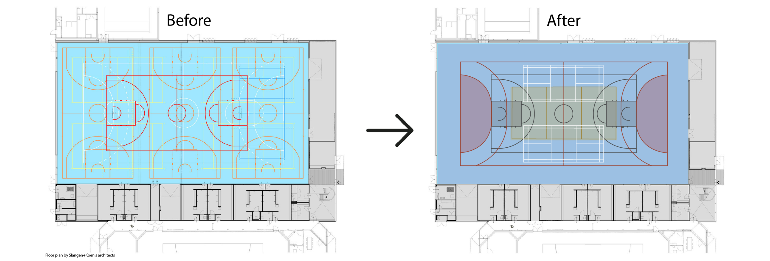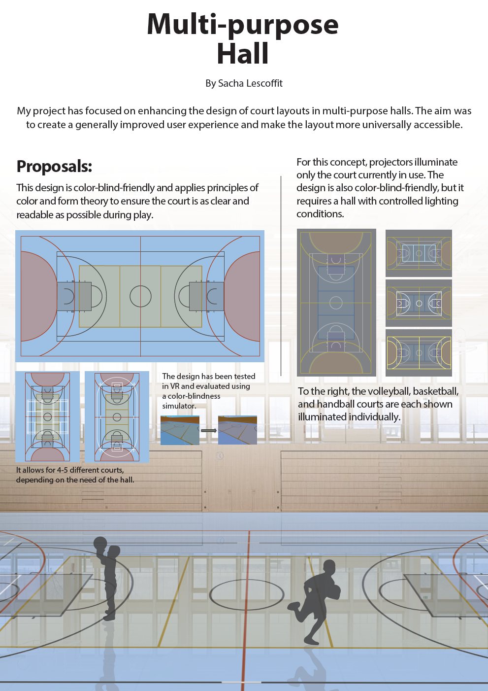 A multi-purpose hall is an indoor space designed to accommodate several different sports and activities on the same court surface. Many of them struggle with court markings that overlap and compete for attention. With several sports sharing the same floor, the result is often confusing for players and officials, and even harder to follow for anyone with color-vision difficulties. Altogether, this makes the halls less intuitive and less user-friendly than they should be.